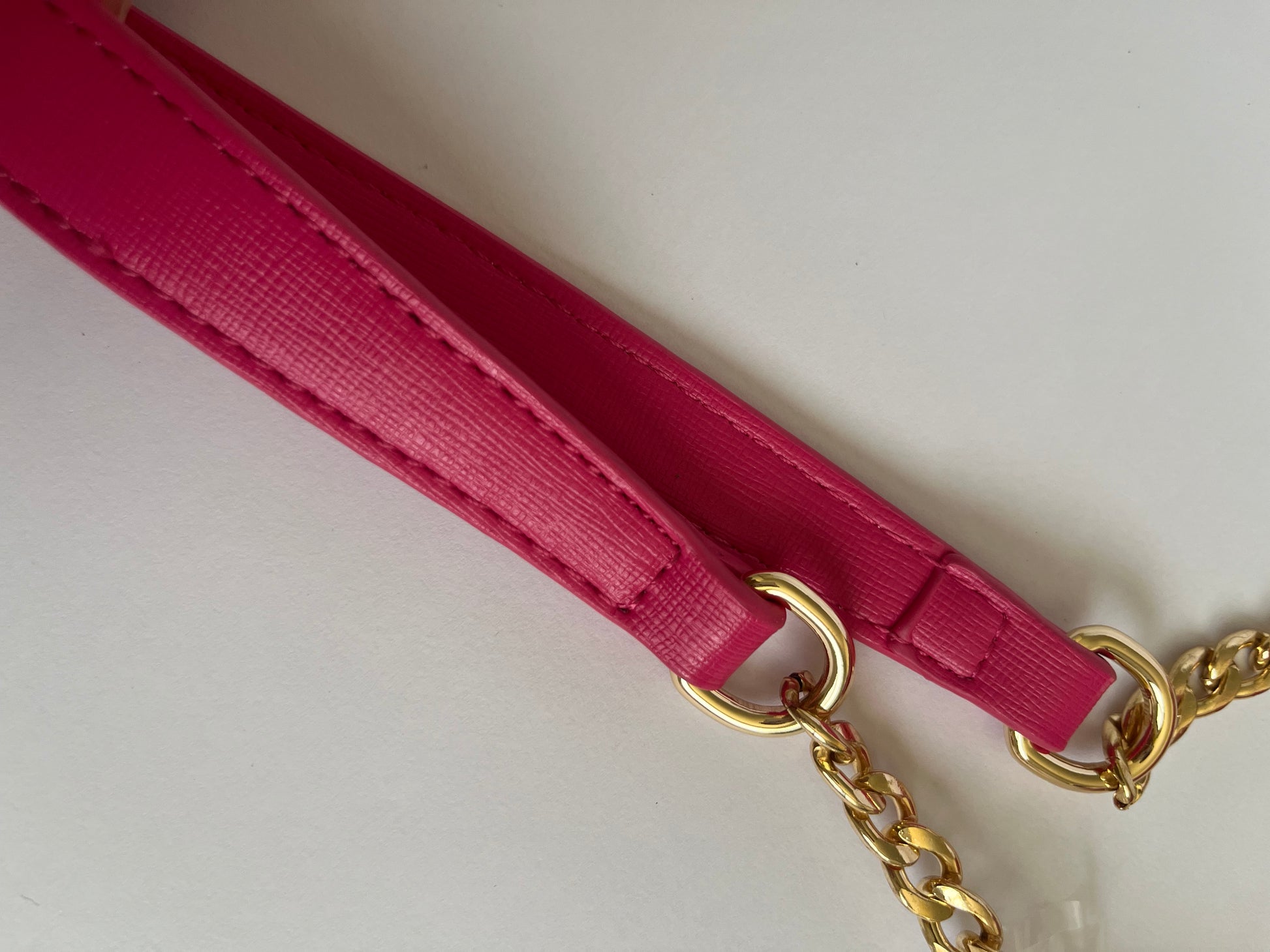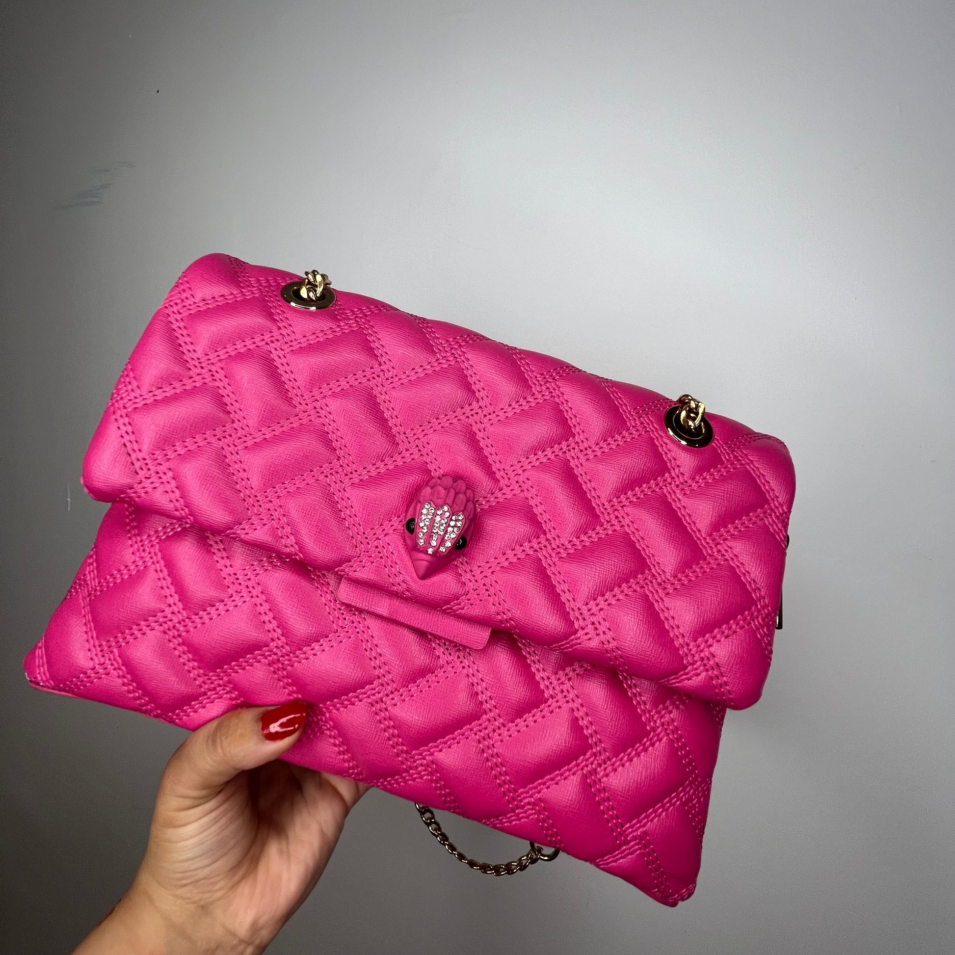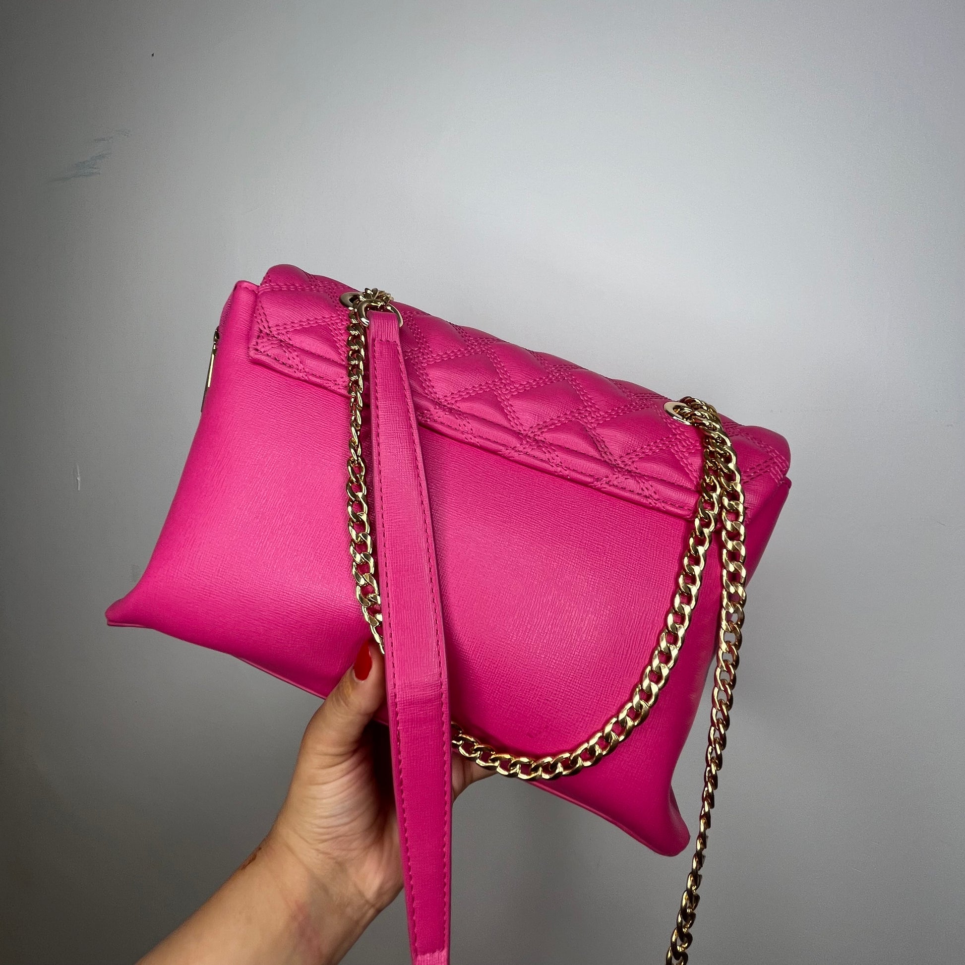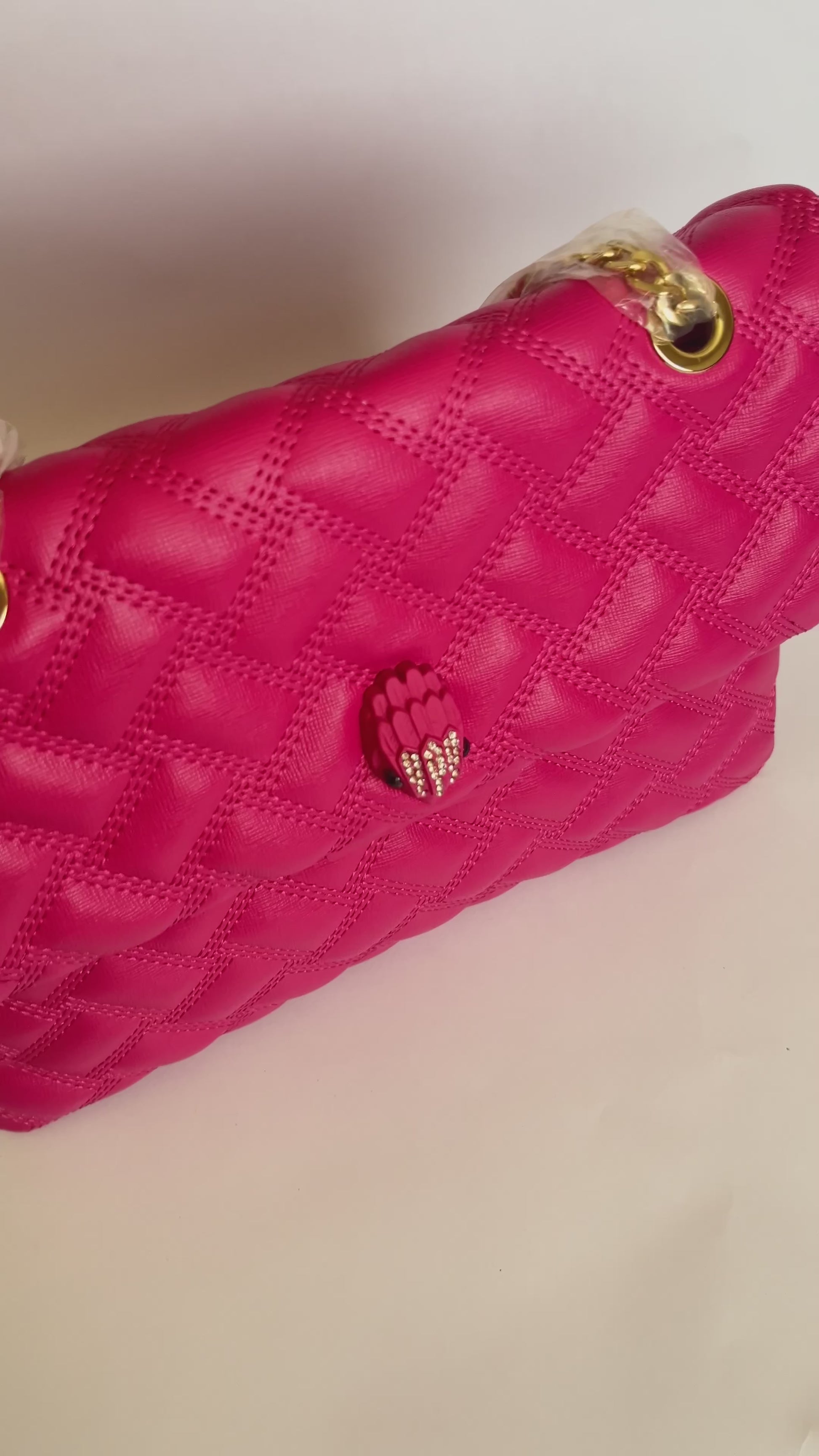 QUILTED EMBELLISHED EMBLEM FUCHSIA PINK COLOR HAND BAG حقيبة يد وردي فوشيا مبطنة مزينة بشعار